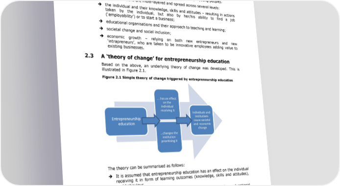 Entrepreneurship Education: A road to success more educators prepared for entrepreneurship education; more institutions practising entrepreneurship education; more engaged and active citizens; more and new social ventures; more innovative employees adding value to existing enterprises; and increased business start-up rate (particularly amongst young people). Hence, expectations are multi-layered and spread across several levels: the individual and their knowledge, skills and attitudes 3 resulting in actions taken by the individual, but also by her/his ability to find a job (8employability9) or to start a business; educational organisations and their approach to teaching and learning; societal change and social inclusion; economic growth 3 relying on both new entrepreneurs and new 8intrapreneurs9, who are taken to be innovative employees adding value to existing businesses. 2.3 A 8theory of change9 for entrepreneurship education Based on the above, an underlying theory of change was developed. This is illustrated in Figure 2.1. Figure 2.1 Simple theory of change triggered by entrepreneurship education .. .has an effect on the individual receiving it Individuals and Entrepreneurship institutions education cause societal and economic change ...changes the institution prioritising it The theory can be summarised as follows: It is assumed that entrepreneurship education has an effect on the individual receiving it in form of learning outcomes (knowledge, skills and attitudes), and behaviour. Equally it is assumed to cause a change in the culture of an educational institution. As a consequence of the behaviour and actions of the individuals and institutions, societal and economic change is stimulated. Through the study, it was aimed to identify reports and examples which illustrate aspects of these chains and relationships. It was anticipated that some measurements may be able to provide evidence of causal links between the different levels, while others would only show impact on one specific level. 18