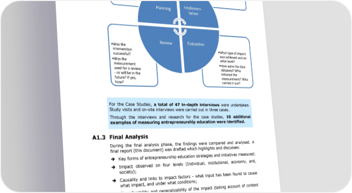 Entrepreneurship Education: A road to success Figure A1.1 Questions related to phases of the policy cycle •What type of intervention was •Who implemented it ? undertaken and by •How, with what scope whom? and on what •What were the aims educational level? of the intervention? Planning Implemen- tation Review Evaluation •Was the •What type of impact intervention was achieved and on successful? what level? •Was the •How were the data measurement obtained? Who used for a review initiated the - or will be in the measurement? Who future? If yes, carried it out? how? For the Case Studies, a total of 47 in-depth interviews were undertaken. Study visits and on-site interviews were carried out in three cases. Through the interviews and research for the case studies, 10 additional examples of measuring entrepreneurship education were identified. A1.3 Final Analysis During the final analysis phase, the findings were compared and analysed. A final report (this document) was drafted which highlights and discusses: Key forms of entrepreneurship education strategies and initiatives measured; Impact observed on four levels (Individual, institutional, economy, and, society); Causality and links to impact factors - what input has been found to cause what impact, and under what conditions; Transferability and generalizability of the impact (taking account of context conditions); Conclusions and lessons learnt as to maximising the impact of entrepreneurship education; Key points as to what constitutes a robust methodology; and Key points for consideration when measuring the impact of entrepreneurship education. 97