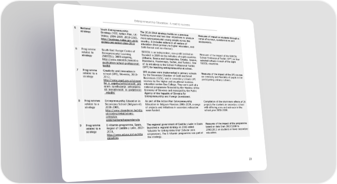 Entrepreneurship Education: A road to success 5 National Youth Entrepreneurship The 2010-2014 strategy builds on a previous Measures of impact on students through a strategy Strategy (YES) Action Plan, UK- funding round and has clear objectives to produce range of surveys, questionnaires and Wales; 2004-2009, 2010-2015, more entrepreneurial young people across the assessments. http://business.wales.gov.uk/bi country. It includes actions in all sectors of gideas/yes-action-plan-2010 education (from primary to higher education, and both formal and non-formal). 6 Programme South East Europe Centre of SEECEL is an independent, non-profit institution Measures of the impact of the SEECEL related to Entrepreneurial Learning founded in 2009 on the initiative of eight countries School Professional Toolkit (SPT) on four strategy (SEECEL); 2009-ongoing, (Albania, Bosnia and Herzegovina, Croatia, Kosovo, selected schools in each of the eight http://www.seecel.hr/seecel-s- Macedonia, Montenegro, Serbia, and Turkey). One SEECEL-countries. publication-school-professional- of its initiatives is the School Professional Toolkit toolkit (SPT) for teaching entrepreneurship at school. 7 Programme Creativity and innovation in UPI courses were implemented in primary schools Measures of the impact of the UPI courses related to a school (UPI), Slovenia; 2010- by the Slovenian Chamber of Craft and Small on creativity and flexibility of pupils in the strategy 2012, Businesses (OZS); and in secondary schools UPI participating primary schools. http://www.mgrt.gov.si/si/zgod courses by the higher and vocational business be_o_uspehu/arhiv/celoviti_pro education centre Gea College. They were part of a gram_spodbujanja_ustvarjalno national programme financed by the Ministry of the sti_inovativnosti_in_podjetnosti Economy of Slovenia and managed by the Public _mladih/ Agency of the Republic of Slovenia for Entrepreneurship and Foreign Investment. 8 Programmes Entrepreneurship Education in As part of the Action Plan Entrepreneurship Compilation of the short-term effects of 21 related to a Secondary School (Belgium-nl) Education in Belgium-Flanders 2006-2009, a range projects for students in secondary school strategy 2008-2009, of projects and initiatives in secondary education with differing aims and outreach in the http://www.vlaanderen.be/nl/p were funded. school year 2008-2009. ublicaties/detail/advies- actieplan- ondernemerschapsonderwijs 9 Programme E-Vitamin-programme, Spain, The regional government of Castilla y León in Spain Measures of the impact of the programme related to a Region of Castilla y León, 2007- launched a regional strategy in 2002 called based on data from 2007/2008 to strategy 2011, 8Educate for Entrepreneurship9 (Educar para 2010/2011 on students in lower secondary http://www.educa.jcyl.es/Vita emprender). The E-Vitamin programme was part of education. minaE/es the strategy. 23
