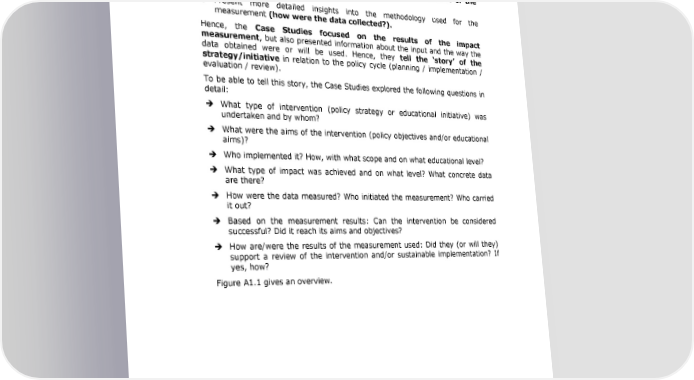 Entrepreneurship Education: A road to success Collect facts and figures about the impact of entrepreneurship education on (one or several) different levels (individual, organisation, society, economy): What change was achieved?); Collect concrete examples of how concrete strategies and initiatives led to results: How was that change achieved?); Gather examples for the use of the measurements results for the review and sustainability of strategies and initiatives: How were the results of the measurements used?); and Present more detailed insights into the methodology used for the measurement (how were the data collected?). Hence, the Case Studies focused on the results of the impact measurement, but also presented information about the input and the way the data obtained were or will be used. Hence, they tell the 8story9 of the strategy/initiative in relation to the policy cycle (planning / implementation / evaluation / review). To be able to tell this story, the Case Studies explored the following questions in detail: What type of intervention (policy strategy or educational initiative) was undertaken and by whom? What were the aims of the intervention (policy objectives and/or educational aims)? Who implemented it? How, with what scope and on what educational level? What type of impact was achieved and on what level? What concrete data are there? How were the data measured? Who initiated the measurement? Who carried it out? Based on the measurement results: Can the intervention be considered successful? Did it reach its aims and objectives? How are/were the results of the measurement used: Did they (or will they) support a review of the intervention and/or sustainable implementation? If yes, how? Figure A1.1 gives an overview. 96