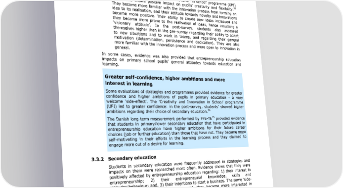 Entrepreneurship Education: A road to success students were more positively impacted by teaching 8entrepreneurship as a method9 3 i.e., using methods stimulating creativity and innovation - rather than as 8an occupation9 3 i.e., teaching business-related skills. The studies conclude that pupils who have experienced an 8entrepreneurship as a method9 have also increased their level of connectedness to school, classmates, and teachers. To increase creativity and flexibility: Evidence from the 8Creativity and innovation in school9 programme (UPI) 33 in Slovenia shows positive impact on pupils9 creativity and flexibility. They become more familiar with the innovation process from forming an idea to its realisation, and their attitude towards novelty and innovations became more positive. Their ability to create new ideas increased and they became more prone to the realisation of ideas, hence assuming a 8visionary attitude9. In the post-survey, students also assessed themselves higher than in the pre-survey regarding their ability to adapt to new situations and to work in teams, and regarding their general motivation (determination, persistence and dedication). They are also more familiar with the innovation process and more open to innovation in general. In some cases, evidence was also provided that entrepreneurship education impacts on primary school pupils9 general attitudes towards education and learning. Greater self-confidence, higher ambitions and more interest in learning Some evaluations of strategies and programmes provided evidence for greater confidence and higher ambitions of pupils in primary education - a very welcome 8side-effect9. The 8Creativity and Innovation in School9 programme (UPI) led to greater confidence: in the post-survey, students9 showed higher 34 ambitions regarding their choice of secondary education. The Danish long-term measurement performed by FFE-YE35 provided evidence that students in primary/lower secondary education that have participated in entrepreneurship education have higher ambitions for their future career choices (job or further education) than those that have not. They became more self-motivating in their efforts in the learning process and they claimed to engage more out of a desire for learning. 3.3.2 Secondary education Students in secondary education were frequently addressed in strategies and impacts on them were researched most often. Evidence shows that they were positively affected by entrepreneurship education regarding: 1) their interest in entrepreneurship; 2) their entrepreneurial knowledge, skills and attitudes/behaviour; and, 3) their intentions to start a business. The same 8side- effect9 as for primary pupils was observed, they became more interested in education as such and their grades improved. To increase the interest in entrepreneurship: 33 Halilović, P. (2013) Doktorska disertacija. Učinki inovacijsko-podjetniškega izobraževanja na spodbujanje inovativnosti in smiselnost uvajanja omenjenih vsebin med osnovnošolce v Sloveniji. Maribor: Ekonomsko- poslovna fakulteta Maribor 34 ibid 35 Young Enterprise Denmark (2014) Impact of Entrepreneurship Education in Denmark 2013 30