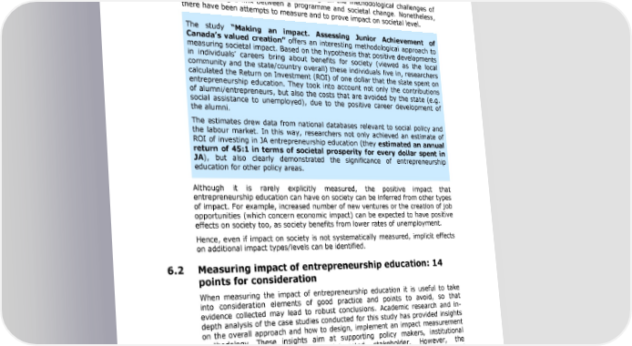 Entrepreneurship Education: A road to success other characteristics of the alumni-founded firms, such as the sector they are active in, and the innovativeness of these sectors etc. In these cases, results from the surveys to inform impact measurement are compared to relevant data from national statistics (e.g. 8Impact. 50 Years of Young Enterprise9 (UK); 8Practice makes perfect?9 (SE)). Other studies use external databases, e.g. in the MIT case study, databases Compustat and Dun & Bradstreet for data on public and private companies respectively. Impact on Society is rarely measured, given the methodological challenges of demonstrating a link between a programme and societal change. Nonetheless, there have been attempts to measure and to prove impact on societal level. The study