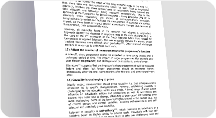 Entrepreneurship Education: A road to success SEECEL, the Netherlands Action Plan, the ASE, the Misgav, and other examples 228 from desk research . 12) Include a pre- and post- survey: The longitudinal approach Pre- and post-measurement can provide strong evidence of impact and demonstrate that change took place. This is important for measuring behavioural 229 impact, which implies action, but such change needs time to become evident . Pre- and post- questionnaires can also eliminate some of the disadvantages of self-reported results. If the aim is to monitor the effect of the programme/strategy in the long run, then more than one post-questionnaire should be used. Such a longitudinal approach, involves the same sample/panel of respondents being followed and their attitudes and behaviour being measured systematically. This is the approach of the Foundation for Entrepreneurship - Young Enterprise (FFE-YE) in Denmark when measuring the impact of entrepreneurship education. Longitudinal approaches can facilitate the measurement of economic and societal impact, as these types of impact concern more macro changes (e.g. number of firms created, their sustainability etc.). However, all examples found in the research that adopted a longitudinal approach identify the decrease in response rates as the main challenge (e.g. in the case of the 2nd evaluation of the Dutch National Action Plan, except for Universities of Applied Sciences). This was especially relevant for alumni, whose tracking becomes more difficult after graduation230. Other reported challenges are lack of resources to undertake such work. 13) Adjust the number of measurements to the programme9s duration A one-off, short programme cannot be expected to have strong impact after a prolonged period of time. The impact of longer programmes (for example one- year Master programmes) and strategies can be expected to endure longer. 231 Literature suggests that the impact of a short programme should be measured before and after; but longer programmes should be monitored before; immediately after the end; some months after the end; and even several years after. 14) Causality is challenging to prove Ideally impact measurement should prove causality, i.e. that entrepreneurship education led to specific changes/results. However, establishing causality is challenging for the education sector as a whole. A broad range of other factors influence an individual9s actions and perceptions as well. As perceptions and actions may need time to change, attributing a clear causal link becomes even more challenging. Some of the lessons/insights offered in this section (e.g. use of control groups and control variables, avoiding self-assessment and self- selection etc.) can help prove causality. 232 Relevant to causality is self-efficacy , which measures an individual9s or a society9s belief on his/her ability to achieve goals. Individuals with high self- efficacy can be expected to be more likely to take over challenging tasks and 228 Junior Achievement Titan Program; 2007 Evaluation, Internet: http://www.myja.org/programs/evaluation/reports/ja_titan_evaluation.pdf; Oosterbeek H., van Praag M., Ijsselstein A. The impact of entrepreneurship education on entrepreneurship skills and motivation. European Economic Review 54 (2010) 442-454 229 According to academic researchers interviewed for the purpose of this study. 230 Volery et al. (2013). 231 Fayolle et al (2006). 232 See Bandura, A. (1997) Self-efficacy: The exercise of control. 82