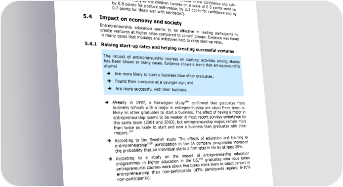 Entrepreneurship Education: A road to success series of change mechanisms, result in increased self-efficacy and empowerment; increased confidence and self-esteem: In general the evidence indicates that the arts and cultural activities resulted in a marked improvement in the self-efficacy and empowerment of many of the children involved. After the project, scores went up by 0.4 points on a 0-5 point scale for 8mastering new skills9 and by 0.3 points for 8belief in abilities9). Similarly, the project resulted in an increase in the confidence and self- esteem of many of the children (scores on a scale of 0-5 points went up by 0.8 points for positive self-image, by 0.3 points for confidence and by 0.7 points for 8deals well with set-backs9). 5.4 Impact on economy and society Entrepreneurship education seems to be effective in leading participants to create ventures at higher rates compared to control groups. Evidence was found in many cases that modules and initiatives help to raise start-up rates. 5.4.1 Raising start-up rates and helping creating successful ventures The impact of entrepreneurship courses on start-up activities among alumni has been shown in many cases. Evidence shows a trend that entrepreneurship alumni Are more likely to start a business than other graduates; Found their company at a younger age; and Are more successful with their business. Already in 1997, a Norwegian study166 confirmed that graduates from business schools with a major in entrepreneurship are about three times as likely as other graduates to start a business. The effect of having a major in entrepreneurship seems to be weaker in most recent surveys undertaken by the same team (2001 and 2003), but entrepreneurship majors remain more than twice as likely to start and own a business than graduates with other 167 majors. According to the Swedish study 8The effects of education and training in 168 entrepreneurship9 participation in the JA company programme increased the probability that an individual starts a firm later in life by at least 20%; According to a study on the impact of entrepreneurship education programmes in higher education in the US,169 graduates who have taken entrepreneurial courses were about five times more likely to select careers in entrepreneurship than non-participants (43% participants against 6-10% non-participants). 166 Kolvereid, L. and Moen, Ø. (1997), 8Entrepreneurship among business graduates: does a major in entrepreneurshipmake a difference?9, Journal of European Industrial Training, 21 (4/5), 154360. 167 Kolvereid,L. and Bjørn Willy Åmo (2007): Entrepreneurship among graduates from business schools: a Norwegian case. In: Handbook of Research in Entrepreneurship Education, Volume 2: Contextual Perspectives. Edited by Alain Fayolle, University of Lyon. 168 Wennberg, K., Elert, N. (2012) - Effekter av utbildning i entreprenörskap 169 Summit Consulting (2009) Toward Effective Education of Innovative Entrepreneurs in Small Business: Initial Results from a Survey of College Students and Graduates. Washington, DC: Small Business Administration Office of Advocacy 67
