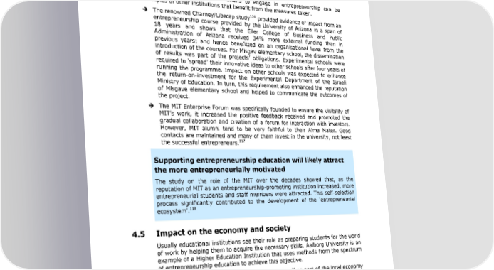 Entrepreneurship Education: A road to success The MIT established close ties with technology-based industries from the start. This was further reinforced in the institutional culture by encouraging faculty and research staff to invest part of their time in developing their own companies. This allowed for the development of several spin-offs, which ensured that MIT staff is closely connected to the relevant business sectors 115 and is up to date with state-of-the-art developments. 4.4.4 Enhanced reputation and better access to funding An important reason for institutions to engage in entrepreneurship can be examples of other institutions that benefit from the measures taken. 116 The renowned Charney/Libecap study provided evidence of impact from an entrepreneurship course provided by the University of Arizona in a span of 18 years and shows that the Eller College of Business and Public Administration of Arizona received 34% more external funding than in previous years; and hence benefitted on an organisational level from the introduction of the courses. For Misgav elementary school, the dissemination of results was part of the projects9 obligations. Experimental schools were required to 8spread9 their innovative ideas to other schools after four years of running the programme. Impact on other schools was expected to enhance the return-on-investment for the Experimental Department of the Israeli Ministry of Education. In turn, this requirement also enhanced the reputation of Misgave elementary school and helped to communicate the outcomes of the project. The MIT Enterprise Forum was specifically founded to ensure the visibility of MIT9s work, it increased the positive feedback received and promoted the gradual collaboration and creation of a forum for interaction with investors. However, MIT alumni tend to be very faithful to their Alma Mater. Good contacts are maintained and many of them invest in the university, not least 117 the successful entrepreneurs. Supporting entrepreneurship education will likely attract the more entrepreneurially motivated The study on the role of the MIT over the decades showed that, as the reputation of MIT as an entrepreneurship-promoting institution increased, more entrepreneurial students and staff members were attracted. This self-selection process significantly contributed to the development of the 8entrepreneurial 118 ecosystem9. 4.5 Impact on the economy and society Usually educational institutions see their role as preparing students for the world of work by helping them to acquire the necessary skills. Aalborg University is an example of a Higher Education Institution that uses methods from the spectrum of entrepreneurship education to achieve this objective. The MIT is a rather unusual case as it regards itself as part of the local economy and defines its generic role as feeding into the (local) business structure. Hence, 115 Massachusetts Institute of Technology and Kauffman Foundation of Entrepreneurship (2009) Entrepreneurial Impact: The Role of MIT 116 Charney, A.,; Libecap, G.D. (2000): Impact of entrepreneurship education. Eller College of Business and Public Administration, University of Arizona. USA 117 Massachusetts Institute of Technology and Kauffman Foundation of Entrepreneurship (2009) Entrepreneurial Impact: The Role of MIT 118 ibid 53