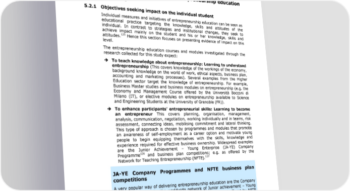 Entrepreneurship Education: A road to success careers in entrepreneurship than non-participants (43% participants against 6-10% non-participants). Entrepreneurship courses also offer a high return-on-investment: A Canadian study measured a 45:1 annual return on 8societal prosperity9 per dollar invested. 5.2 The objectives of individual entrepreneurship education measures 5.2.1 Objectives seeking impact on the individual student Individual measures and initiatives of entrepreneurship education can be seen as educational practice targeting the knowledge, skills and attitudes of the individual. In contrast to strategies and institutional changes, they seek to achieve impact mainly on the student and his or her knowledge, skills and 125 attitudes. Hence this section focuses on presenting evidence of impact on this level. The entrepreneurship education courses and modules investigated through the research collected for this study expect: To teach knowledge about entrepreneurship: Learning to understand entrepreneurship (This covers knowledge of the workings of the economy, background knowledge on the world of work, ethical aspects, business plan, accounting and marketing processes). Several examples from the Higher Education sector target the knowledge of entrepreneurship. For example, Business Master studies and business modules on entrepreneurship (e.g. the Economy and Management Course offered by the Università Bocconi di Milano (IT), or elective modules on entrepreneurship available to Science and Engineering Students at the University of Grenoble (FR)). To enhance participants9 entrepreneurial skills: Learning to become an entrepreneur This covers planning, organisation, management, analysis, communication, negotiation, working individually and in teams, risk assessment, connecting ideas, mobilising commitment and lateral thinking. This type of approach is chosen by programmes and modules that promote an awareness of self-employment as a career option and motivate young people to begin equipping themselves with the skills, knowledge and experience required for effective business ownership. Widespread examples are the Junior Achievement 3 Young Enterprise (JA-YE) Company 126 Programme and business plan competitions; e.g. as offered by the Network for Teaching Entrepreneurship (NFTE).127 JA-YE Company Programmes and NFTE business plan competitions A very popular way of delivering entrepreneurship education are the Company Programme offered by the worldwide network of Junior achievement 3 Young Enterprise (JA-YE); and the business plan competition model offered by NFTE organisations worldwide. These initiatives lead students through the entire process of developing a business idea, developing a business plan, setting up 125 Cf.: Framework Contract No EAC 19/06 Order 129: Mapping of teachers' preparation for entrepreneurship education. Final Report by GHK for DG EDUCATION AND CULTURE, 2011. P 6-7. Available online: http://ec.europa.eu/education/more-information/doc/2011/mappingsum_en.pdf 126 http://ja-ye.org/about-ja-ye-europe 127 http://www.nfte.be/index.php?id=24&L=2, https://www.nfte.com/ 58