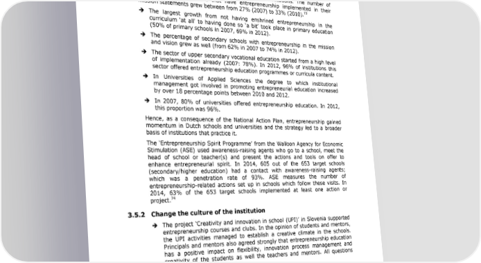 Entrepreneurship Education: A road to success 3.5.1 Embedding entrepreneurship education in all education levels The Entrepreneurship Education National Action Plan in the Netherlands placed particular emphasis on influencing institutions and encouraging them to offer more entrepreneurship education. Evidence showed that between 2007 and 2012, entrepreneurship became more deeply embedded in the mission statements, programmes and curricula of educational institutions in all sectors. Entrepreneurship education had become a more common feature, and courses were offered by a growing number of education institutions. The number of institutions across sectors that have entrepreneurship implemented in their 73 mission statements grew between from 27% (2007) to 33% (2010). The largest growth from not having enshrined entrepreneurship in the curriculum 8at all9 to having done so 8a bit9 took place in primary education (50% of primary schools in 2007, 69% in 2012). The percentage of secondary schools with entrepreneurship in the mission and vision grew as well (from 62% in 2007 to 74% in 2012). The sector of upper secondary vocational education started from a high level of implementation already (2007: 78%). In 2012, 96% of institutions this sector offered entrepreneurship education programmes or curricula content. In Universities of Applied Sciences the degree to which institutional management got involved in promoting entrepreneurial education increased by over 18 percentage points between 2010 and 2012. In 2007, 80% of universities offered entrepreneurship education. In 2012, this proportion was 96%. Hence, as a consequence of the National Action Plan, entrepreneurship gained momentum in Dutch schools and universities and the strategy led to a broader basis of institutions that practice it. The 8Entrepreneurship Spirit Programme9 from the Walloon Agency for Economic Stimulation (ASE) used awareness-raising agents who go to a school, meet the head of school or teacher(s) and present the actions and tools on offer to enhance entrepreneurial spirit. In 2014, 605 out of the 653 target schools (secondary/higher education) had a contact with awareness-raising agents; which was a penetration rate of 93%. ASE measures the number of entrepreneurship-related actions set up in schools which follow these visits. In 2014, 63% of the 653 target schools implemented at least one action or project.74 3.5.2 Change the culture of the institution The project 8Creativity and innovation in school (UPI)9 in Slovenia supported entrepreneurship courses and clubs. In the opinion of students and mentors, the UPI activities managed to establish a creative climate in the schools. Principals and mentors also agreed strongly that entrepreneurship education has a positive impact on flexibility, innovation process management and creativity of the students as well the teachers and mentors. All questions 73 Gibcus, P. et al. (2010) Onderwijs en Ondernemerschap, Eenmeting 2010, Petra Gibcus, Maarten Overweel, Sita Tan, Michel Winnubst, Zoetermeer, May 2010; and van der Aa, R. et al. (2012) Ondernemerschap in het onderwijs, Tweemeting, Eindrapport, Ruud van der Aa, Susan van Geel, Etienne van Nuland, Rotterdam, November 2012 . 74 Newcom (2012) for ASE - Enquête sur l'esprit d'entreprendre dans l'enseignement. Enquête sur la vision des enseignants sur l9Esprit d9Entreprendre 3 Synthèse des résultats 38