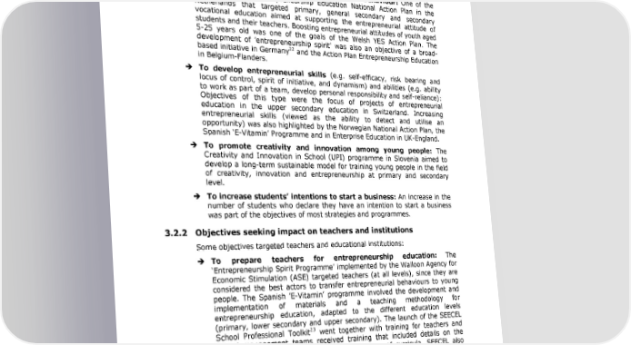 Entrepreneurship Education: A road to success objective to make pupils/students more interested in entrepreneurship. Entrepreneurship was mostly viewed as an intention to start a business in the future. The objective was directly linked to inputs that raised awareness, offered specific knowledge, and provided hands-on experience and interaction with existing entrepreneurs. For example, in Wales, the YES 21 Action Plan included the development of a website and a campaign to inform students and stakeholders and to promote the Action Plan. To increase entrepreneurial attitudes and/or behaviour: One of the objectives of the Entrepreneurship Education National Action Plan in the Netherlands that targeted primary, general secondary and secondary vocational education aimed at supporting the entrepreneurial attitude of students and their teachers. Boosting entrepreneurial attitudes of youth aged 5-25 years old was one of the goals of the Welsh YES Action Plan. The development of 9entrepreneurship spirit9 was also an objective of a broad- 22 based initiative in Germany and the Action Plan Entrepreneurship Education in Belgium-Flanders. To develop entrepreneurial skills (e.g. self-efficacy, risk bearing and locus of control, spirit of initiative, and dynamism) and abilities (e.g. ability to work as part of a team, develop personal responsibility and self-reliance): Objectives of this type were the focus of projects of entrepreneurial education in the upper secondary education in Switzerland. Increasing entrepreneurial skills (viewed as the ability to detect and utilise an opportunity) was also highlighted by the Norwegian National Action Plan, the Spanish 8E-Vitamin9 Programme and in Enterprise Education in UK-England. To promote creativity and innovation among young people: The Creativity and Innovation in School (UPI) programme in Slovenia aimed to develop a long-term sustainable model for training young people in the field of creativity, innovation and entrepreneurship at primary and secondary level. To increase students9 intentions to start a business: An increase in the number of students who declare they have an intention to start a business was part of the objectives of most strategies and programmes. 3.2.2 Objectives seeking impact on teachers and institutions Some objectives targeted teachers and educational institutions: To prepare teachers for entrepreneurship education: The 8Entrepreneurship Spirit Programme9 implemented by the Walloon Agency for Economic Stimulation (ASE) targeted teachers (at all levels), since they are considered the best actors to transfer entrepreneurial behaviours to young people. The Spanish 9E-Vitamin9 programme involved the development and implementation of materials and a teaching methodology for entrepreneurship education, adapted to the different education levels (primary, lower secondary and upper secondary). The launch of the SEECEL School Professional Toolkit23 went together with training for teachers and school management teams received training that included details on the project, what each school should do and types of curricula. SEECEL also offers a platform through which teachers, school management and national contact points could communicate and exchange ideas and practices24. 21 http://business.wales.gov.uk/bigideas/ 22 8Entrepreneurial spirit into schools9. In: Josten, Martina, Marco van Elkan: "Unternehmergeist in die Schulen?! Ergebnisse aus der Inmit-Studie zu Entrepreneurship Education-Projekten an deutschen Schulen". 2010" 23 http://www.seecel.hr/seecel-s-publication-school-professional-toolkit 24 http://www.seecel.hr/cop 27