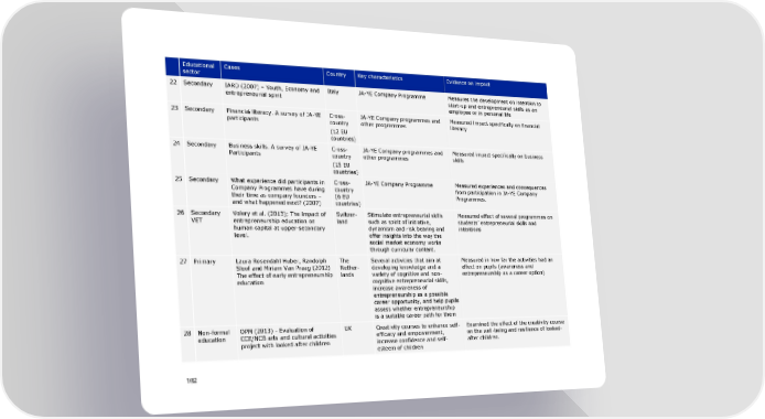 Educational Cases Country Key characteristics Evidence on impact sector 22 Secondary IARD (2007) 3 Youth, Economy and Italy JA-YE Company Programme Measures the development on intention to entrepreneurial spirit start-up and entrepreneurial skills as an employee or in personal life 23 Secondary Financial literacy. A survey of JA-YE Cross- JA-YE Company programmes and Measured impact specifically on financial participants country other programmes literacy (12 EU countries) 24 Secondary Business skills. A survey of JA-YE Cross- JA-YE Company programmes and Measured impact specifically on business Participants country other programmes skills (15 EU countries) 25 Secondary What experience did participants in Cross- JA-YE Company Programme Measured experiences and consequences Company Programmes have during country from participation in JA-YE Company their time as company founders 3 (6 EU Programmes. and what happened next? (2007) countries) 26 Secondary Volery et al. (2013); The impact of Switzer- Stimulate entrepreneurial skills Measured effect of several programmes on VET entrepreneurship education on land such as spirit of initiative, students9 entrepreneurial skills and human capital at upper-secondary dynamism and risk bearing and intentions level. offer insights into the way the social market economy works through curricular content. 27 Primary Laura Rosendahl Huber, Randolph The Several activities that aim at Measured in how far the activities had an Sloof and Miriam Van Praag (2012) Nether- developing knowledge and a effect on pupils (awareness and The effect of early entrepreneurship lands variety of cognitive and non- entrepreneurship as a career option) education cognitive entrepreneurial skills, increase awareness of entrepreneurship as a possible career opportunity, and help pupils assess whether entrepreneurship is a suitable career path for them 28 Non-formal OPM (2013) - Evaluation of UK Creativity courses to enhance self- Examined the effect of the creativity course education CCE/NCB arts and cultural activities efficacy and empowerment, on the well-being and resilience of looked- project with looked after children increase confidence and self- after children. esteem of children 102