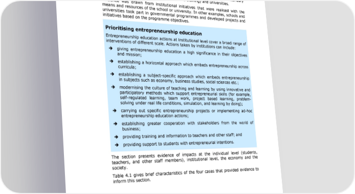 Entrepreneurship Education: A road to success 4 The impact of institutional changes prioritising entrepreneurship education 4.1 Introduction This section describes the effects of entrepreneurship education actions taken and implemented at institutional level by schools (primary and secondary education as well as vocational education and training) and universities. Evidence was drawn from institutional initiatives that were realised with the means and resources of the school or university. In other examples, schools and universities took part in governmental programmes and developed projects and initiatives based on the programme objectives. Prioritising entrepreneurship education Entrepreneurship education actions at institutional level cover a broad range of interventions of different scale. Actions taken by institutions can include: giving entrepreneurship education a high significance in their objectives and mission; establishing a horizontal approach which embeds entrepreneurship across curricula; establishing a subject-specific approach which embeds entrepreneurship in subjects such as economy, business studies, social sciences etc.; modernising the culture of teaching and learning by using innovative and participatory methods which support entrepreneurial skills (for example, self-regulated learning, team work, project based learning, problem- solving under real life conditions, simulation, and learning by doing); carrying out specific entrepreneurship projects or implementing ad-hoc entrepreneurship education actions; establishing greater cooperation with stakeholders from the world of business; providing training and information to teachers and other staff; and providing support to students with entrepreneurial intentions. The section presents evidence of impacts at the individual level (students, teachers, and other staff members), institutional level, the economy and the society. Table 4.1 gives brief characteristics of the four cases that provided evidence to inform this section. 44