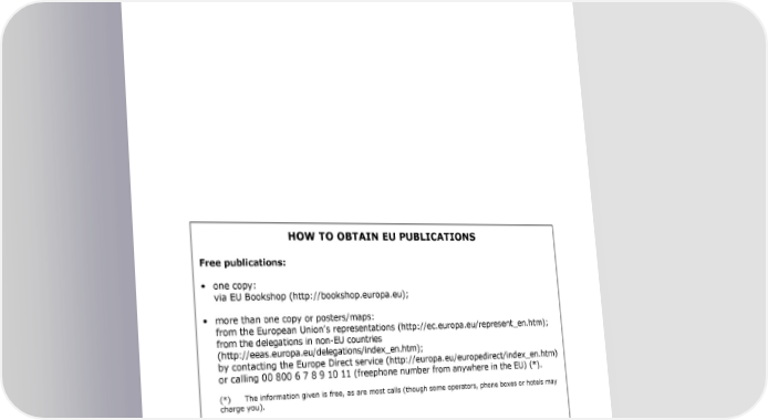 HOW TO OBTAIN EU PUBLICATIONS Free publications: • one copy: via EU Bookshop (http://bookshop.europa.eu); • more than one copy or posters/maps: from the European Union9s representations (http://ec.europa.eu/represent_en.htm); from the delegations in non-EU countries (http://eeas.europa.eu/delegations/index_en.htm); by contacting the Europe Direct service (http://europa.eu/europedirect/index_en.htm) or calling 00 800 6 7 8 9 10 11 (freephone number from anywhere in the EU) (*). (*) The information given is free, as are most calls (though some operators, phone boxes or hotels may charge you). Priced publications: • via EU Bookshop (http://bookshop.europa.eu). Priced subscriptions: • via one of the sales agents of the Publications Office of the European Union (http://publications.europa.eu/others/agents/index_en.htm).