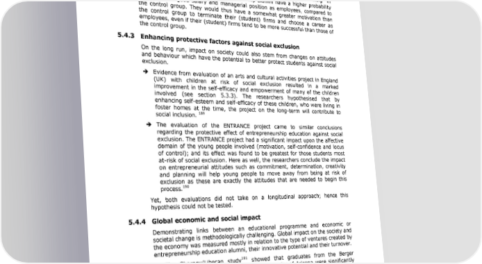 Entrepreneurship Education: A road to success educated in entrepreneurship have a considerably higher income than 188 untrained. The more training and education, the higher the income. Hence, participants to entrepreneurship courses may benefit from the training in more than one way. Paradoxically, the high chances of entrepreneurship graduates to get into well- paid positions as employees can have a detrimental effect on foundation rates of alumni: The Swedish study 8The effects of education and training in entrepreneurship9 found that entrepreneurship alumni have a higher probability of attaining a good salary and managerial position as employees, compared to the control group. They would thus have a somewhat greater motivation than the control group to terminate their (student) firms and choose a career as employees, even if their (student) firms tend to be more successful than those of the control group. 5.4.3 Enhancing protective factors against social exclusion On the long run, impact on society could also stem from changes on attitudes and behaviour which have the potential to better protect students against social exclusion. Evidence from evaluation of an arts and cultural activities project in England (UK) with children at risk of social exclusion resulted in a marked improvement in the self-efficacy and empowerment of many of the children involved (see section 5.3.3). The researchers hypothesised that by enhancing self-esteem and self-efficacy of these children, who were living in foster homes at the time, the project on the long-term will contribute to 189 social inclusion. The evaluation of the ENTRANCE project came to similar conclusions regarding the protective effect of entrepreneurship education against social exclusion. The ENTRANCE project had a significant impact upon the affective domain of the young people involved (motivation, self-confidence and locus of control); and its effect was found to be greatest for those students most at-risk of social exclusion. Here as well, the researchers conclude the impact on entrepreneurial attitudes such as commitment, determination, creativity and planning will help young people to move away from being at risk of exclusion as these are exactly the attitudes that are needed to begin this 190 process. Yet, both evaluations did not take on a longitudinal approach; hence this hypothesis could not be tested. 5.4.4 Global economic and social impact Demonstrating links between an educational programme and economic or societal change is methodologically challenging. Global impact on the society and the economy was measured mostly in relation to the type of ventures created by entrepreneurship education alumni, their innovative potential and their turnover. 191 The Charney/Libecap study showed that graduates from the Berger Entrepreneurship Programme at the University of Arizona were significantly 187 Charney/Libecap 2000, GEM, Young Enterprise Denmark 188 Other factors were taken into consideration, such as gender, age, other education, and employment. 189 ibid 190 Peffers J., Huddleston P., Banfalvy C., Weiss Sh., Aparisi J. (2002). Enterprise and its transfer to combat social exclusion- ENTRANCE. Final Report 191 Charney, A., Libecap, G.D. (2000) Impact of entrepreneurship education. Eller College of Business and Public Administration, University of Arizona. USA ibid 71