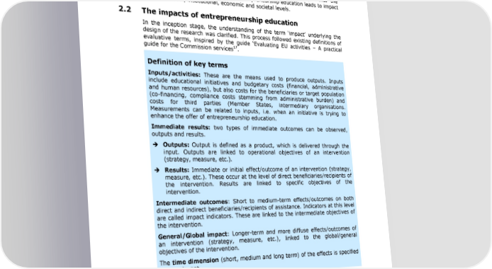 Entrepreneurship Education: A road to success 2 How entrepreneurship education is expected to impact 2.1 Introduction This section summarises the main assumptions underlying the approach to this study. It clarifies the understanding of the terms used and presents the underlying 8theory of change9 on how entrepreneurship education leads to impact at the individual, institutional, economic and societal levels. 2.2 The impacts of entrepreneurship education In the inception stage, the understanding of the term 8impact9 underlying the design of the research was clarified. This process followed existing definitions of evaluative terms, inspired by the guide 8Evaluating EU activities 3 A practical guide for the Commission services17. Definition of key terms Inputs/activities: These are the means used to produce outputs. Inputs include educational initiatives and budgetary costs (financial, administrative and human resources), but also costs for the beneficiaries or target population (co-financing, compliance costs stemming from administrative burden) and costs for third parties (Member States, intermediary organisations. Measurements can be related to inputs, i.e. when an initiative is trying to enhance the offer of entrepreneurship education. Immediate results: two types of immediate outcomes can be observed, outputs and results. Outputs: Output is defined as a product, which is delivered through the input. Outputs are linked to operational objectives of an intervention (strategy, measure, etc.). Results: Immediate or initial effect/outcome of an intervention (strategy, measure, etc.). These occur at the level of direct beneficiaries/recipients of the intervention. Results are linked to specific objectives of the intervention. Intermediate outcomes: Short to medium-term effects/outcomes on both direct and indirect beneficiaries/recipients of assistance. Indicators at this level are called impact indicators. These are linked to the intermediate objectives of the intervention. General/Global impact: Longer-term and more diffuse effects/outcomes of an intervention (strategy, measure, etc.), linked to the global/general objectives of the intervention. The time dimension (short, medium and long term) of the effects is specified when relevant. Entrepreneurship education is expected to contribute to a broad range of policy objectives and to have an impact on many different levels of society and the economy. Concrete policy strategies, programmes and teaching approaches for entrepreneurship education are expected to impact in terms of: more educational offers for entrepreneurship education; 17 European Commission 2004, http://ec.europa.eu/dgs/secretariat_general/evaluation/docs/eval_activities_en.pdf 17