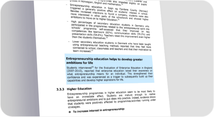 Entrepreneurship Education: A road to success 8Financial literacy9 and 8Planning9. For both groups, entrepreneurial 53 intentions grew 3 for girls more than for boys. To increase engagement and achieve better grades: As with primary education, evidence was also found in secondary education that entrepreneurship education has very desirable 8side-effects9: It was found that participating in programmes connected to the Norwegian Action Plan had a positive effect on secondary students9 oral and writing skills. The programmes also impacted slightly on pupils9 54 grades in Norwegian, English and mathematics. Entrepreneurship education in Sogn og Fjordane County (Norway) triggered a generally positive effect on students9 interest in school. Besides increased intentions to found a company, students were also more interested in other parts of the schoolwork and showed higher 55 ambitions to move on to Higher Education. High percentages of secondary education students in Germany who participated in the programmes related to the 8entrepreneurial spirit into schools9 programme self-assessed that they improved on key competences like teamwork (62%), communication skills (55.2%) and presentation skills (54.6%). Teachers rated this improvement even higher 56 than the students themselves. Lower secondary education students in Denmark who have been taught using entrepreneurial teaching methods reported that they feel more connected to school, classmates and teachers and that their motivation to learn increased.57 Entrepreneurship education helps to develop greater ambitions for life Students interviewed58 for the Evaluation of Enterprise Education in England (2007-2010), reported that enterprise education raised their awareness on what entrepreneurship means for an individual. This strengthened their confidence and was experienced as a trigger to subsequently build up their capabilities and develop higher aspirations for life. 3.3.3 Higher Education Entrepreneurship programmes in higher education seem to be most likely to have an immediate effect. Students are mature enough to realise entrepreneurial ambitions and to put ideas into practice. Indeed, evidence shows that students were positively affected by programmes/activities running under strategies. To increase interest in entrepreneurship: 53 Young Enterprise Denmark (2013) Impact of Entrepreneurship Education in Denmark 2012 54 Johansen, V. et al. (2012) =Entreprenørskap i utdanningen og oppnåelse av læringsmål= 55 Rotefoss, B. et al. (2009) - Entreprenørskap på høygir! - en evaluering av satsningen på entreprenørskap i grunnopplæringen i Sogn og Fjordane 56 Josten, M., van Elkan, M. (2010) Unternehmergeist in die Schulen?! Ergebnisse aus der Inmit-Studie zu Entrepreneurship Education-Projekten an deutschen Schulen 57 Young Enterprise Denmark (2013) Impact of Entrepreneurship Education in Denmark 2012 58 Qualitative interviews 34