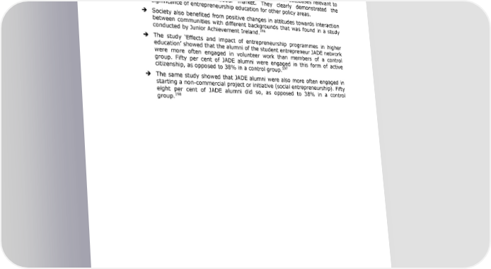 Entrepreneurship Education: A road to success Nonetheless, there have been attempts to prove direct impact on societal level. 195 The study 8Making an impact9 found that JA Canada delivers a 45:1 annual return on 8societal prosperity9 per dollar invested. Researchers estimated the Return on Investment (ROI) of each dollar that the state spent on entrepreneurship education. They took into account not only contributions of alumni/entrepreneurs, but also the costs that are avoided by the state (e.g. social assistance to unemployed), due to the positive career developments of the alumni. The estimates drew on data from national databases relevant to social policy and the labour market. They clearly demonstrated the significance of entrepreneurship education for other policy areas. Society also benefited from positive changes in attitudes towards interaction between communities with different backgrounds that was found in a study conducted by Junior Achievement Ireland.196 The study 8Effects and impact of entrepreneurship programmes in higher education9 showed that the alumni of the student entrepreneur JADE network were more often engaged in volunteer work than members of a control group. Fifty per cent of JADE alumni were engaged in this form of active 197 citizenship, as opposed to 38% in a control group. The same study showed that JADE alumni were also more often engaged in starting a non-commercial project or initiative (social entrepreneurship). Fifty eight per cent of JADE alumni did so, as opposed to 38% in a control 198 group. 195 The Boston Consulting Group (2011) Making an Impact. Assessing Junior Achievement of Canada's Value Creation 196 Junior Achievement (2013) Evaluation of KEY and LET programmes, 2012/2013. 197 European Commission, DG ENTR (2012) Effects and impact of entrepreneurship programmes in Higher Education. 198 Ibid, page 72 73