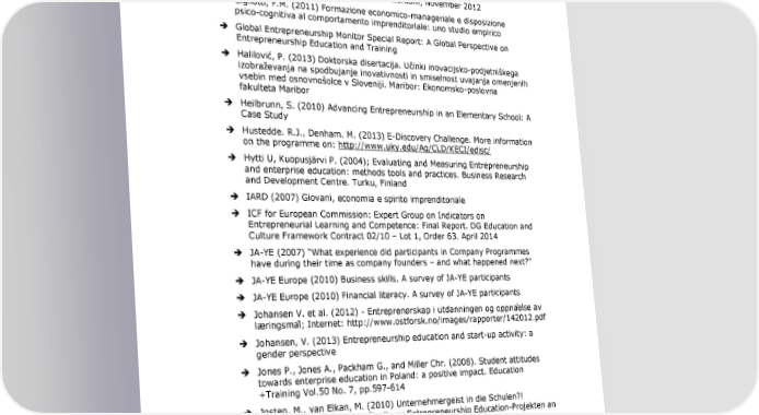 Entrepreneurship Education 3 A road to success Garalis A. and Strazdiene G. (2007). Entrepreneurial skills development via Simulation Business Enterprise. Social Research, issue: 10/2007, pages:39- 48 GEM (2009) Special Report on Education and Training, available at http://www.gemconsortium.org/docs/download/276 Gibcus, P. et al. (2010) Onderwijs en Ondernemerschap, Eenmeting 2010, May 2010; and van der Aa, R. et al. (2012) Ondernemerschap in het onderwijs, Tweemeting, Eindrapport, Rotterdam, November 2012 Gigliotti, F.M. (2011) Formazione economico-manageriale e disposizione psico-cognitiva al comportamento imprenditoriale: uno studio empirico Global Entrepreneurship Monitor Special Report: A Global Perspective on Entrepreneurship Education and Training Halilović, P. (2013) Doktorska disertacija. Učinki inovacijsko-podjetniškega izobraževanja na spodbujanje inovativnosti in smiselnost uvajanja omenjenih vsebin med osnovnošolce v Sloveniji. Maribor: Ekonomsko-poslovna fakulteta Maribor Heilbrunn, S. (2010) Advancing Entrepreneurship in an Elementary School: A Case Study Hustedde. R.J., Denham. M. (2013) E-Discovery Challenge. More information on the programme on: http://www.uky.edu/Ag/CLD/KECI/edisc/ Hytti U, Kuopusjärvi P. (2004); Evaluating and Measuring Entrepreneurship and enterprise education: methods tools and practices. Business Research and Development Centre. Turku, Finland IARD (2007) Giovani, economia e spirito imprenditoriale ICF for European Commission: Expert Group on Indicators on Entrepreneurial Learning and Competence: Final Report. DG Education and Culture Framework Contract 02/10 3 Lot 1, Order 63. April 2014 JA-YE (2007)