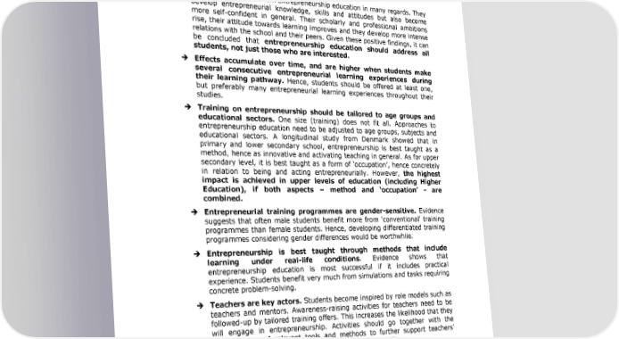 Entrepreneurship Education: A road to success be expected to have positive effects on society too, as society benefits from lower rates of unemployment. 7.3 Maximising the impact of entrepreneurship education: Lessons learnt When aiming to maximise the impact of entrepreneurship education, the following lessons should be considered: Students can benefit from entrepreneurship education in many regards. They develop entrepreneurial knowledge, skills and attitudes but also become more self-confident in general. Their scholarly and professional ambitions rise, their attitude towards learning improves and they develop more intense relations with the school and their peers. Given these positive findings, it can be concluded that entrepreneurship education should address all students, not just those who are interested. Effects accumulate over time, and are higher when students make several consecutive entrepreneurial learning experiences during their learning pathway. Hence, students should be offered at least one, but preferably many entrepreneurial learning experiences throughout their studies. Training on entrepreneurship should be tailored to age groups and educational sectors. One size (training) does not fit all. Approaches to entrepreneurship education need to be adjusted to age groups, subjects and educational sectors. A longitudinal study from Denmark showed that in primary and lower secondary school, entrepreneurship is best taught as a method, hence as innovative and activating teaching in general. As for upper secondary level, it is best taught as a form of 8occupation9, hence concretely in relation to being and acting entrepreneurially. However, the highest impact is achieved in upper levels of education (including Higher Education), if both aspects – method and 8occupation9 - are combined. Entrepreneurial training programmes are gender-sensitive. Evidence suggests that often male students benefit more from 8conventional9 training programmes than female students. Hence, developing differentiated training programmes considering gender differences would be worthwhile. Entrepreneurship is best taught through methods that include learning under real-life conditions. Evidence shows that entrepreneurship education is most successful if it includes practical experience. Students benefit very much from simulations and tasks requiring concrete problem-solving. Teachers are key actors. Students become inspired by role models such as teachers and mentors. Awareness-raising activities for teachers need to be followed-up by tailored training offers. This increases the likelihood that they will engage in entrepreneurship. Activities should go together with the dissemination of relevant tools and methods to further support teachers9 motivation and capacity to set-up entrepreneurial activities. A whole-school approach to entrepreneurship education helps to raise teachers9 awareness of the value and impact of integrating enterprise within different subjects. Schools in the UK with higher levels of Enterprise Education embedded into the curriculum reported higher levels of staff motivation. The understanding of entrepreneurship education as a teaching and learning style improved. Teachers and educational institutions that implement entrepreneurship education overcome their initial scepticism when they see the positive effect on students. 89