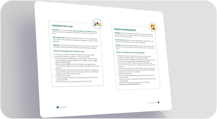 PARTNERS FOR A DAY MINIENTREPRENEURSHIPS Description: 15-17 year old students get to see what a real workplace is like by Description: Guided by the teacher, students aged 15-19 get to experience entre- spending a day with a professional in a sector they would like to be a part of in the preneurial decision-making by creating, organising and managing a company (with future. real money, products and customers). What students learn: Teamwork, connection between work and professional ca- What students learn: Creativity, innovation, market research, critical thinking, conict reers, analysis of the requirements and opportunities available in a particular profes- resolution, team management, autonomy, initiative and leadership. sional area. Objectives: To awaken entrepreneurial attitudes, skills and knowledge that will enable Objectives: To offer teens an opportunity to get a close-up look at the reality of work, students to turn ideas into action and develop the skills required in today’s labour as well as the skills they will need to develop to break into their dream profession. market. Results of the longitudinal study of Partners for a Day: Results of the longitudinal study of minientrepreneurships: • Increases the probability of students wanting to go to university by 13%. • Increases the probability of students wanting to go to university by 27%. • Increases the probability of wanting to be self-employed by 8%. • Increases the probability of wanting to be self-employed by 32%. • Increases the students’ identication with qualities that are crucial to personal • Increases the students’ identication with qualities that are crucial to personal and and social wellbeing: imagination (16%), hard work (22%), perseverance (28%), 27%) and delayed gratication (32%). social wellbeing: perseverance ( delayed gratication (14%). • Reduces by at least 18% the tolerance for behaviours not aligned with the • Reduces by at least 23% the tolerance for behaviours not aligned with the common interest: cheating on an exam, shoplifting, using public transport without common interest: cheating on an exam, shoplifting, using public transport without paying, etc. paying, etc. • Increases academic performance by at least 10% in mathematics, language and • Increases academic performance by at least 7% in mathematics, language and science, with the greatest improvement among students from less advantaged science, with the greatest improvement among students from less advantaged backgrounds and previously lower achievers. backgrounds and previously lower achievers. • Reduces truancy by 13%. • Reduces truancy by 6%. • Improves by approximately 25% the levels of perseverance for tasks that lack • Improves the levels of perseverance for tasks that lack intrinsic motivation by intrinsic motivation. 12%. approximately • Increases the proportion of young people helping in the family business without • Increases the percentage of young people who have jobs by 5%. 4%. being paid by • Increases the percentage of young people who have jobs by 8%. • Increases the probability of wanting to be self-employed by 13%. Increases actual employability rate by 13% Lorem ipsum JUNIOR ACHIEVEMENT ׀׆٪٪UǼȬƇƤɅ٪ȷɅɍƫɬ ׀ׇ