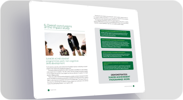 Following the same students over several years made it possible to gather the informa- tion needed to identify causal effects in a more precise way, making the study as rigorous and robust as any study intended to identify causal effects can be. The longitudinal Impact Study conrms the positive effects on those values or qualities that the scientic literature has shown to promote lifelong well-being, such as perseverance, imagination, delayed gratication, hard work, civic capital or growth mindset. ׄ. Overall conclusions of the impact study JUNIOR ACHIEVEMENT PROGRAMMES PRODUCE SOCIAL RETURNS Scientic evidence suggests that educational programmes, by working on non-cognitive skills, improve students’ job prospects and promote their present and future personal well-being. JUNIOR ACHIEVEMENT PROGRAMMES CHANGE BEHAVIOUR Junior Achievement educational programmes not only change students’ identication with their stated preferences but also have a positive inuence on their revealed preferences, i.e. their behaviour. This leads to profound behavioural changes, e.g., reducing truancy and improving their academic performance in mathematics, science or language. JUNIOR ACHIEVEMENT PROGRAMMES CHANGE MINDSETS Educational programmes succeed in improving students’ growth mindsets by encouraging them to identify with the idea that it is effort, not innate intellectual ability, which determines life outcomes. JUNIOR ACHIEVEMENT programmes work: non-cognitive skills development JUNIOR ACHIEVEMENT PROGRAMMES HELP TO REDUCE SOCIAL INEQUALITY For the last four years the Junior Achievement Foundation has been conducting a research Educational programmes typically have a greater impact on young people project on the impact of its educational programmes. from economically disadvantaged households, which helps to reduce the The results obtained during this time conrm the positive causal effects of Junior Achieve- opportunity gap between young people from different backgrounds. ment programmes on students. They also conrm that the younger the students targeted by the programmes and the more programmes that are delivered, the greater the impact and the multiplying effect. That is why Junior Achievement has designed a complete curriculum of programmes from DEMONSTRATED: primary education to university level education to facilitate the development of non-cognitive JUNIOR ACHIEVEMENT skills in a structured and sequential manner from the earliest ages. The Impact Study con- rms that the methodology and delivery of these programmes contributes to the develop- PROGRAMMES WORK ment of the participating students’ non-cognitive skills. ׀־٪ Impact study JUNIOR ACHIEVEMENT ׀ֿ