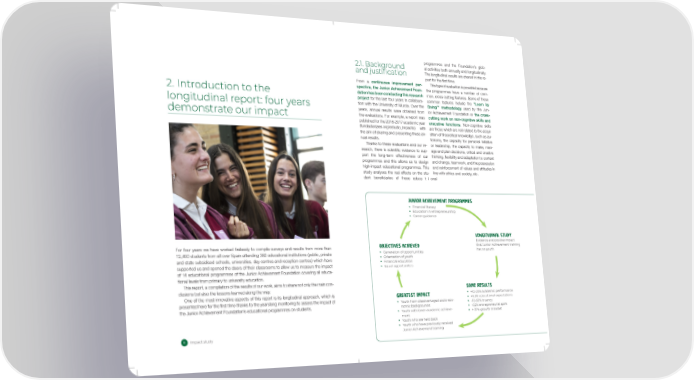 programmes and the Foundation’s glob- ׀.1. Background al activities both annually and longitudinally. and justification The longitudinal results are shared in this re- port for the rst time. From a continuous improvement per- This type of evaluation is possible because spective, the Junior Achievement Foun- the programmes have a number of com- ׀.٪Introduction to the dation has been conducting this research mon, cross-cutting features. Some of these project for the last four years in collabora- common features include the “Learn by longitudinal report: four years٪ tion with the University of Murcia. Over the Doing”* methodology used by the Jun- years, annual results were obtained from ior Achievement Foundation or the cross- demonstrate our impact the evaluations. For example, a report was cutting work on non-cognitive skills and published for the 2016-2017 academic year executive functions. Non- cognitive skills (fundacionjaes.org/estudio_impacto) with are those which are not related to the acqui- the aim of sharing and presenting these an- sition of theor etical knowledge, such as au- nual results. tonomy, the capacity for personal initiative Thanks to these evaluations and our re- or leadership, the capacity to make, man- search, there is scientic evidence to sup- age and plan decisions, critical and creative port the long-term effectiveness of our thinking, exibility and adaptation to context programmes and this allows us to design and change, teamwork, and the possession high-impact educational programmes. This and reinforcement of values and attitudes in study analyses the real effects on the stu- line with ethics and society, etc. dent beneciaries of these educa t i onal JUNIOR ACHIEVEMENT PROGRAMMES • Financial literacy • Education in entrepreneurship • Career guidance LONGITUDINAL STUDY Evidence and positive impact For four years we have worked tirelessly to compile surveys and results from more than OBJECTIVES ACHIEVED that Junior Achievement training 12,400 students from all over Spain attending 382 educational institutions (public, private • Generation of opportunities has on youth and state subsidised schools, universities, day centres and reception centres) which have • Orientation of youth • Financial education supported us and opened the doors of their classrooms to allow us to measure the impact • Equal opportunities of 14 educational programmes of the Junior Achievement Foundation covering all educa- tional levels from primary to university education. This report, a compilation of the results of our work, aims to share not only the main con- clusions but also the lessons learned along the way. SOME RESULTS One of the most innovative aspects of this report is its longitudinal approach, which is GREATEST IMPACT • +10-20% academic performance presented here for the rst time thanks to the yearslong monitoring to assess the impact of • Youth from disadvantaged socio-eco- • +6.5% educational expectations the Junior Achievement Foundation’s educational programmes on students. nomic backgrounds • -10-30% truancy • Youth with lower academic achieve- • +22% entrepreneurial spirit ment • + 37% growth mindset • Youth who are held back • Youth who have previously received 8 Impact study Junior Achievement training
