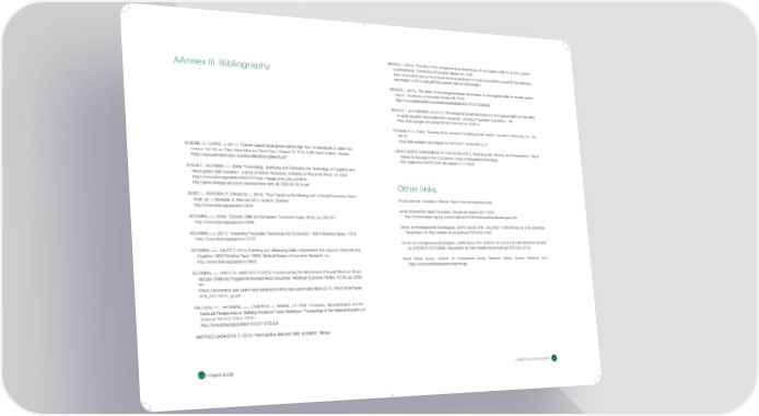 MENDEZ, I. (2015). “The effect of the intergenerational transmission of noncognitive skills on student academ- ic performance”. Economics of Education Review 46: 78-97. http://www.mecd.gob.es/dctm/inee/internacional/pisa2012-resolucionproblemas/pisa2012rproblemasa- ǾǾƲɫ٪UUUؘ٪ǛƣdzǛȉǍȯƇȬǕɬ secundario7-5-2014-web.pdf?documentId=0901e72b819490b0 MENDEZ, I. (2015). “The effect of the intergenerational transmission of noncognitive skills on student perfor- mance”. Economics of Education Review 46: 78-97. http://www.sciencedirect.com/science/article/pii/S0272775715000266 MENDEZ, I. and ZAMARRO, G. (2017). “The intergenerational transmission of noncognitive skills and their effect on adult education and employment outcomes”, Journal of Population Economics, 1-40. https://link.springer.com/article/10.1007/s00148-017-0661-0 PUTNAM, R. D. (1995). “Bowling Alone: America’s Declining Social Capital”. Journal of Democracy 6:1, Jan, 65-78. https://link.springer.com/chapter/10.1007/978-1-349-62397-6_12 ALMOND, D., CURRIE, J. (2011). “Human Capital Development before Age Five.” In Handbook of Labor Eco- UNITED STATES DEPARTMENT OF EDUCATION (2013). Promoting Grit, Tenacity, and Perseverance: Critical nomics. Vol. 4B, ed. Orley Ashenfelter and David Card, Chapter 15, 1315-1486. North Holland. Elsevier. Factors for Success in the 21st Century. Ofce of Educational Technology. https://www.princeton.edu/~jcurrie/publications/galleys2.pdf http://pgbovine.net/OET-Draft-Grit-Report-2-17-13.pdf CUNHA F., HECKMAN J.J. (2008) “Formulating, Identifying and Estimating the Technology of Cognitive and Noncognitive Skill Formation”. Journal of Human Resources, University of Wisconsin Press, vol. 43(4). https://www.jstor.org/stable/40057370?seq=1#page_scan_tab_contents http://jenni.uchicago.edu/econ_neurosci/idest-tech_all_2006-05-29_fc.pdf Other links: GUISO, L., SAPIENZA, P., ZINGALES, L. (2010). “Civic Capital as the Missing Link” In Social Economics Hand- book, ed. J. Benhabib, A. Bisin and M.O. Jackson. Stanford. Educar para ser. University of Murcia. https://www.educarparaser.org/ http://www.nber.org/papers/w15845 Junior Achievement Spain Foundation. Estudio de Impacto 2017-2018. HECKMAN, J.J. (2008). “Schools, Skills and Synapses”. Economic Inquiry 46 (3), pp. 289-324. http://fundacionjaes.org/wp-content/uploads/2018/04/informeEstudiodeimpacto.Pdf http://www.nber.org/papers/w14064 Centro de Investigaciones Sociológicas. (2001) Estudio 2440. VALORES Y CREENCIAS DE LOS JÓVENES. HECKMAN, J.J. (2011). “Integrating Personality Psychology into Economics”. NBER Working Papers 17378. Recuperado de: http://analisis.cis.es/cisdb.jsp?ESTUDIO=2440 http://www.nber.org/papers/w17378 Centro de Investigaciones Sociológicas. (2008) Study 2753. SURVEY OF YOUTH IN SPAIN SONDEO SOBRE HECKMAN, J.J., KAUTZ T. (2013) Fostering and Measuring Skills: Interventions that Improve Character and LA JUVENTUD EN ESPAÑA. Recuperado de: http://analisis.cis.es/cisdb.jsp?ESTUDIO=2753 Cognition. NBER Working Paper 19656. National Bureau of Economic Research, Inc. http://www.nber.org/papers/w19656 World Values Survey. Institute for Comparative Survey Research Vienna. Austria. Retrieved from: https://www.worldvaluessurvey.org/wvs.jsp HECKMAN, J.J., PINTO, R., SAVELYEV, P. (2013). “Understanding the Mechanisms Through Which an Inuen- tial Early Childhood Programme Boosted Adult Outcomes.” American Economic Review 103 (6), pp. 2052- 86. https://economics.sas.upenn.edu/sites/economics.sas.upenn.edu/files/u21/0_PerryFactorPaper_ AER_2012-09-07_sjs.pdf KNUDSEN, E.I., HECKMAN, J.J., CAMERON, J., SHONK, J.P. 2006. “Economic, Neurobiological, and Be- havioural Perspectives on Building America’s Future Workforce.” Proceedings of the National Academy of Sciences 103 (27): 10155-10162. http://www.pnas.org/content/103/27/10155.full MARTINEZ-GABALDON, E. (2016). “Noncognitive skills and trafc accidents”. Mimeo. 40٪٪UǼȬƇƤɅ٪ȷɅɍƫɬ JUNIOR ACHIEVEMENT 41
