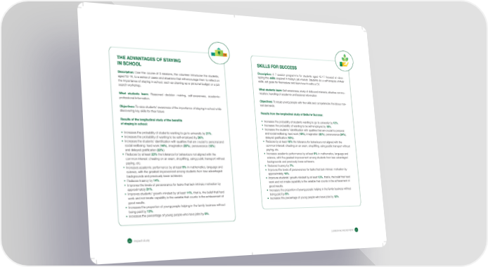 THE ADVANTAGES OF STAYING SKILLS FOR SUCCESS IN SCHOOL Description: A 7-session programme for students aged 15-17 focused on deve- Description: Over the course of 5 sessions, the volunteer introduces the students, loping the skills required in today’s job market. Students do a self-analysis of their aged 12-14, to a series of cases and situations that will encourage them to reect on skills, set goals for themselves and learn how to write a CV. the importance of staying in school, such as drawing up a personal budget or a job search workshop. What students learn: Self-awareness, study of skills and interests, effective commu- nication, handling of academic-professional information What students learn: Reasoned decision making, self-awareness, academic- professional information. Objectives: To equip young people with the skills and competencies the labour mar- ket demands. Objectives: To raise students’ awareness of the importance of staying in school while discovering key skills for their future Results from the longitudinal study of Skills for Success: Results of the longitudinal study of the benets • Increases the probability of students wanting to go to university by 12%. of staying in school: • Increases the probability of wanting to be self-employed by 18%. • Increases the students’ identication with qualities that are crucial to personal 19%), imagination (22%), perseverance (24%), • Increases the probability of students wanting to go to university by 21%. and social wellbeing: hard work ( • Increases the probability of wanting to be self-employed by 24%. delayed gratication (10%). • Increases the students’ identication with qualities that are crucial to personal and • Reduces by at least 18% the tolerance for behaviours not aligned with the social wellbeing: hard work (14%), imagination (20%), perseverance (18%) common interest: cheating on an exam, shoplifting, using public transport without and delayed gratication (23%). paying, etc. • Reduces by at least 23% the tolerance for behaviours not aligned with the • Increases academic performance by at least 9% in mathematics, language and common interest: cheating on an exam, shoplifting, using public transport without science, with the greatest improvement among students from less advantaged paying, etc. backgrounds and previously lower achievers. • Increases academic performance by at least 9% in mathematics, language and • Reduces truancy by 7%. science, with the greatest improvement among students from less advantaged • Improves the levels of perseverance for tasks that lack intrinsic motivation by 14%. backgrounds and previously lower achievers. approximately • Reduces truancy by 14%. • Improves students’ growth mindset by at least 13%, that is, the belief that hard • Improves the levels of perseverance for tasks that lack intrinsic motivation by work and not innate capability is the variable that counts in the achievement of 21%. good results. approximately • Improves students’ growth mindset by at least 11%, that is, the belief that hard • Increases the proportion of young people helping in the family business without 8%. work and not innate capability is the variable that counts in the achievement of being paid by good results. • Increases the percentage of young people who have jobs by 12%. • Increases the proportion of young people helping in the family business without being paid by 12%. • Increases the percentage of young people who have jobs by 8%. JUNIOR ACHIEVEMENT ׀ׄ٪ Impact study ׀ׅ