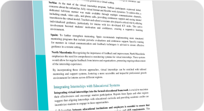 The experiences from each participating country highlight unique approaches and lessons in strengthening mentoring and support: Italy: The Italian report underscores the importance of continuous support during internships, emphasizing the need for not only mentorship but also access to technological resources and learning platforms to foster professional growth in a virtual setting. Serbia: At the start of the virtual internship program, Serbian participants expressed initial concerns about the unfamiliar, fully virtual format and flexible work dynamics. To address this, a dedicated full-time mentor was made available through multiple communication channels, including email, video calls, and phone calls, providing continuous support and easing interns' transition to the virtual model. Teachers and school associates also played a critical role by offering individualized guidance, particularly for interns with less developed ICT skills. This active involvement boosted students' motivation and confidence, creating a supportive learning environment. Spain: To further strengthen mentoring, Spain recommends implementing more structured mentoring programs that include periodic evaluations and continuous support. Specific training for mentors in virtual communication and feedback techniques is advised to ensure effective guidance in a remote setting. North Macedonia: Recognizing the importance of feedback and improvement, North Macedonia emphasizes the need for comprehensive monitoring systems for virtual internships. These systems would allow for regular feedback from interns and organizations, promoting ongoing enhancement of the internship experience. By incorporating these diverse approaches, virtual internships can be enriched with tailored mentoring and support systems, fostering a more accessible and impactful professional growth environment for interns across different regions. Integrating Internships with Educational Systems Integrating virtual internships into the formal educational framework is crucial to maximize their effectiveness and encourage student participation. Reports from Spain and other regions suggest that aligning internships with educational curricula and providing academic credits can incentivize students to engage in these opportunities. Collaboration between educational institutions and employers is essential to ensure that internship experiences are relevant to market expectations and skill requirements. This alignment will help students acquire the competencies necessary for their future careers while also enabling employers to access a skilled talent pool.