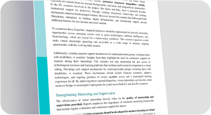 Promoting Inclusivity and Accessibility Inclusivity in virtual internships is essential to ensure that all students, regardless of background, have equitable opportunities. The VI4IS project revealed that while virtual internships can significantly broaden access, persistent structural inequalities remain, especially for students from low-income backgrounds, rural areas, and marginalized communities. In the EU countries involved in the project, like Spain and Italy, there is generally broader institutional support for inclusivity through existing educational frameworks and funding mechanisms aimed at disadvantaged students. However, in non-EU countries like Serbia and North Macedonia, limitations in funding, digital infrastructure, and institutional support present additional barriers for low-income and rural students. To counteract these disparities, targeted initiatives should be implemented to diversify internship opportunities across emerging sectors such as green technologies, artificial intelligence, and biotechnology, which are crucial for a future-ready workforce. This sectoral expansion would make virtual internships appealing and accessible to a wider range of students, aligning opportunities with the evolving labor market. Additionally, creating targeted support mechanisms for underrepresented groups, including those with disabilities, is essential. Insights from Italy highlight the need for continuous support for students during their internships. This includes not only mentorship but also access to technological resources and learning platforms that facilitate professional development in a virtual setting. Providing such support mechanisms for underrepresented groups, including those with disabilities, is essential. These mechanisms should include financial assistance, adaptive technologies, and ongoing guidance to ensure equitable access and a meaningful learning experience for all. By addressing these regional disparities, virtual internships can become a more inclusive bridge to meaningful employment for youth across both EU and non-EU countries. Strengthening Mentoring and Supervision The effectiveness of virtual internships heavily relies on the quality of mentorship and supervision provided. Reports emphasize the importance of structured mentoring frameworks that include regular evaluations and continuous support for interns. To enhance mentoring, training programs should be developed for mentors focusing on virtual communication techniques and effective feedback mechanisms. Continuous supervision is vital; internship programs should incorporate periodic evaluations to facilitate ongoing improvement and skill development for interns. By establishing clear objectives and providing constructive feedback, mentors can significantly impact the interns’ professional growth.
