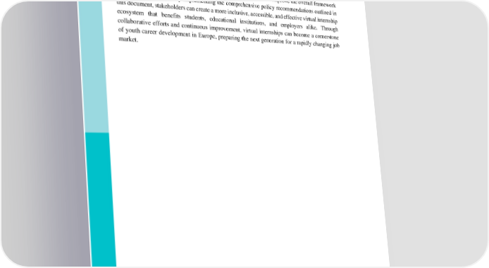 Conclusion The insights gathered from the VI4IS project and regional reports highlight the transformative potential of virtual internships in enhancing youth employability across Europe. However, to realize this potential, it is essential to address existing barriers and improve the overall framework for virtual internships. By implementing the comprehensive policy recommendations outlined in this document, stakeholders can create a more inclusive, accessible, and effective virtual internship ecosystem that benefits students, educational institutions, and employers alike. Through collaborative efforts and continuous improvement, virtual internships can become a cornerstone of youth career development in Europe, preparing the next generation for a rapidly changing job market.
