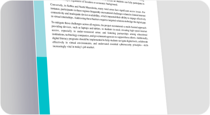 In Spain, where digital infrastructure is comparatively advanced, the focus has shifted to providing additional digital literacy training to enhance students' adaptability to remote work settings. In cases where beneficiaries lacked necessary equipment, efforts were made to supply them with the required tools. Spanish stakeholders emphasize that ongoing technological support, including devices and high-quality internet access, is essential to ensure all students can fully participate in virtual internships, regardless of location or economic background. Conversely, in Serbia and North Macedonia, many rural areas face significant access issues. For instance, participants in these regions frequently encountered challenges related to limited internet connectivity and inadequate device availability, which impacted their ability to engage effectively in virtual internships. Addressing these barriers requires targeted solutions to bridge the digital gap. To mitigate these challenges across all regions, the project recommends a multi-faceted approach: providing devices, such as laptops and tablets, to students in need; ensuring high-speed internet access, especially in under-resourced areas; and fostering partnerships among educational institutions, technology companies, and government agencies to support these efforts. Additionally, digital literacy programs should be implemented to help students navigate digital tools, collaborate effectively in virtual environments, and understand essential cybersecurity principles—skills increasingly vital in today's job market.