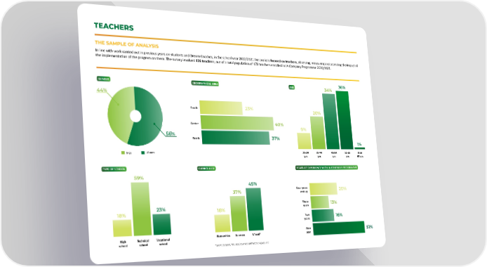 TEACHERS THE SAMPLE OF ANALYSIS In line with work carried out in previous years on students and Dream Coaches, in the school year 2020/2021 the analysis focused on teachers, observing, measuring and assessing the impact of the implementa琀椀on of the program on them. The survey involved 126 teachers, out of a total popula琀椀on of 170 teachers enrolled in JA Company Programme 2020/2021. GENDER GEOGRAPHICAL AREA AGE 34% 36% 44% South 23% 20% Center 40% 9% 56% 37% North 1% Men Women 25-34 35-44 45-54 55-65 than y.o. y.o. y.o. y.o. 65 y.o. TYPE OF SCHOOL CURRICULUM YEARS OF EXPERIENCE WITH JA COMPANY PROGRAMME 59% 45% 37% Four years 20% and up Three 13% 18% 23% 18% years Two 16% years First 51% Humani琀椀es Sciences Mixed* year High Technical Voca琀椀onal school school school *Sport sciences, Nau琀椀cal sciences and technologies, etc.