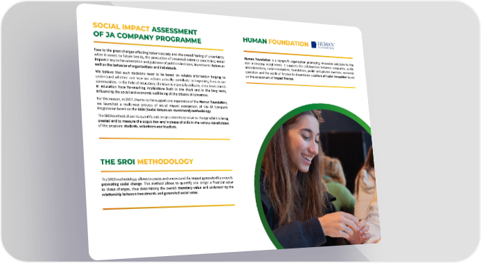 SOCIAL IMPACT ASSESSMENT HUMAN FOUNDATION OF JA COMPANY PROGRAMME Face to the great changes a昀昀ec琀椀ng today’s society and the overall feeling of uncertainty Human Founda琀椀on is a nonpro昀椀t organiza琀椀on promo琀椀ng innova琀椀ve solu琀椀ons to the when it comes to future trends, the produc琀椀on of empirical evidence concerning social ever increasing social needs. It supports the collabora琀椀on between companies, public impact is key to the orienta琀椀on and guidance of poli琀椀cal decisions, investment choices as administra琀椀ons, social enterprises, founda琀椀ons, public and private investors, economic well as the behavior of organiza琀椀ons and individuals. operators and the world of 昀椀nance to disseminate a culture of social innova琀椀on based on the assessment of impact 昀椀nance. We believe that such decisions need to be based on reliable informa琀椀on helping to understand whether and how our ac琀椀ons actually contribute to improving lives in our communi琀椀es. In the 昀椀eld of educa琀椀on, the issue is especially delicate, since investments in educa琀椀on have far-reaching implica琀椀ons both in the short and in the long term, in昀氀uencing the social and economic well-being of the ci琀椀zens of tomorrow. For this reason, in 2017, thanks to the support and experience of the Human Founda琀椀on, we launched a mul琀椀-year process of social impact assessment of the JA Company Programme based on the SROI (Social Return on Investment) methodology. The SROI method allows to quan琀椀fy and assign a monetary value to change which is being created and to measure the acquisi琀椀on and increase of skills in the various stakeholders of the program: students, volunteers and teachers. THE SROI METHODOLOGY The SROI methodology allows to assess and understand the impact generated by projects promo琀椀ng social change. This method allows to quan琀椀fy and assign a 昀椀nancial value to these changes, thus determining the overall monetary value and underscoring the rela琀椀onship between investments and generated social value.