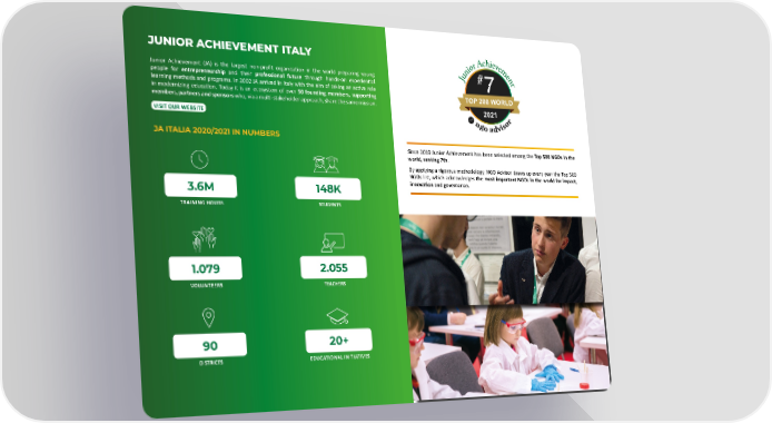 JUNIOR ACHIEVEMENT ITALY Junior Achievement (JA) is the largest non-pro昀椀t organiza琀椀on in the world preparing young people for entrepreneurship and their professional future through hands-on experien琀椀al learning methods and programs. In 2002 JA arrived in Italy with the aim of taking an ac琀椀ve role in modernizing educa琀椀on. Today it is an ecosystem of over 50 founding members, suppor琀椀ng members, partners and sponsors who, via a mul琀椀-stakeholder approach, share the same mission. VISIT OUR WEBSITE JA ITALIA 2020/2021 IN NUMBERS Since 2019 Junior Achievement has been selected among the Top 500 NGOs in the world, ranking 7th. By applying a rigorous methodology, NGO Advisor draws up every year the Top 500 NGOs list, which acknowledges the most important NGOs in the world for impact, 3.6M 148K innova琀椀on and governance. TRAINING HOURS STUDENTS 1.079 2.055 VOLUNTEERS TEACHERS 90 20+ DISTRICTS EDUCATIONAL INITIATIVES